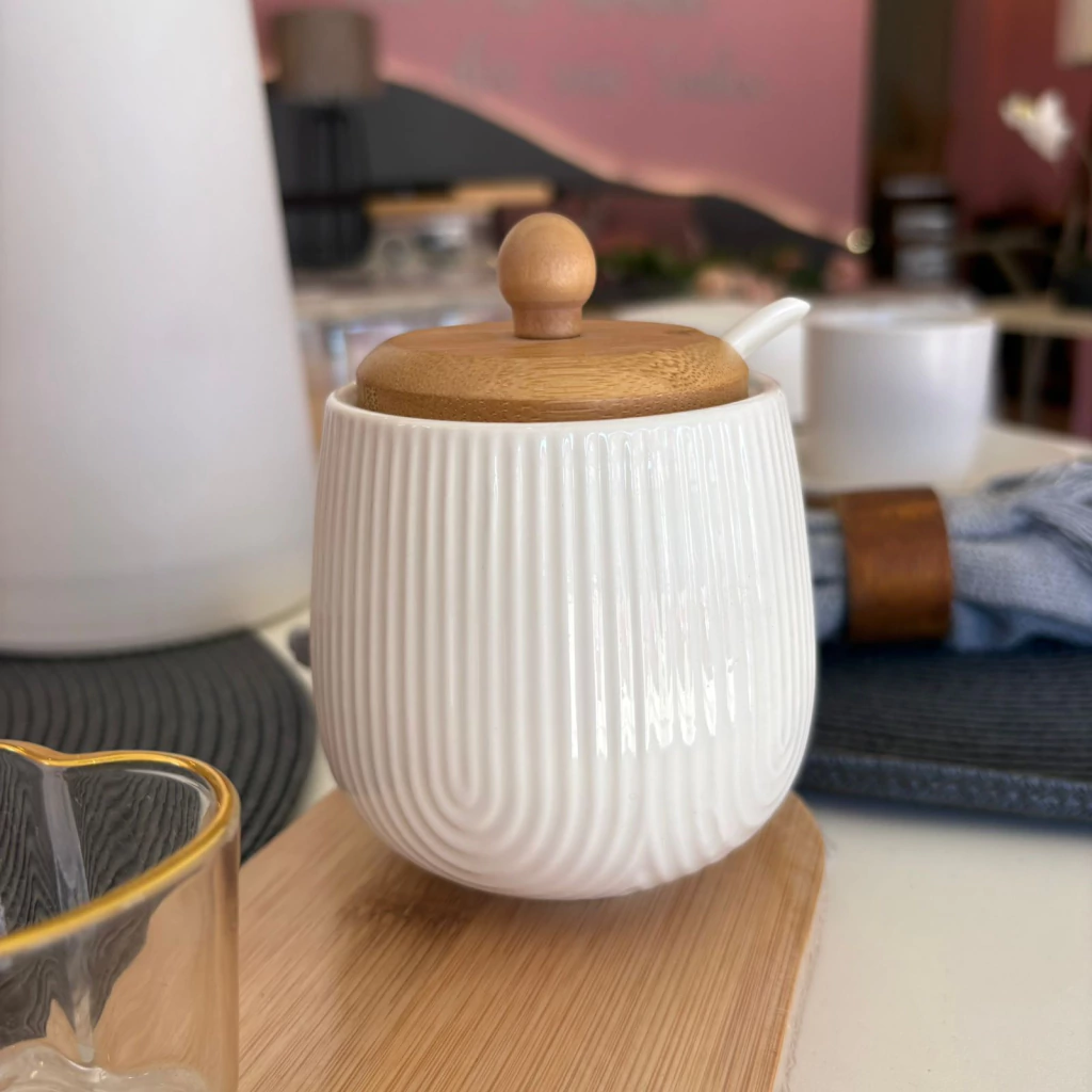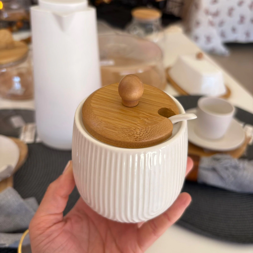 O Açucareiro Oasis é feito em cerâmica de alta qualidade, trazendo um visual moderno e elegante para a cozinha ou para o cantinho do café. A tampa em bambu adiciona um toque natural e mantém o conteúdo protegido, enquanto a colher inclusa facilita o uso no dia a dia.