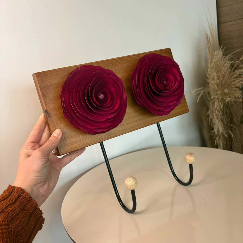 Organize seus itens com charme e delicadeza usando este cabideiro em madeira decorado com duas flores perfumáveis. Perfeito para entradas, quartos, banheiros ou escritórios, ele une praticidade, decoração e aroma agradável em um único item.