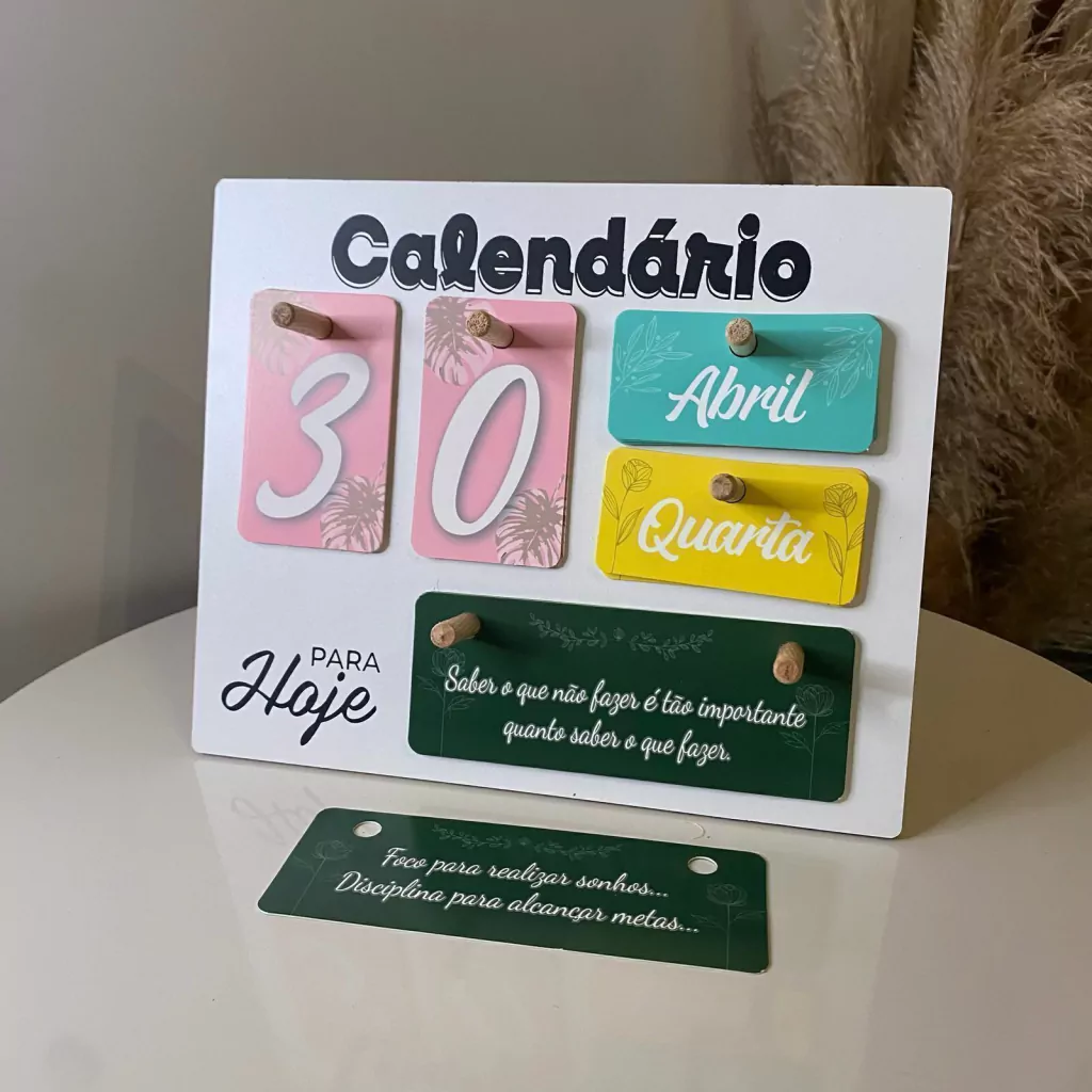 Deixe seus dias mais organizados e cheios de inspiração com este calendário decorativo permanente em MDF! Com design colorido e moderno, ele é ideal para decorar mesas, aparadores ou escritórios, além de manter o controle dos dias de forma prática e sustentável.