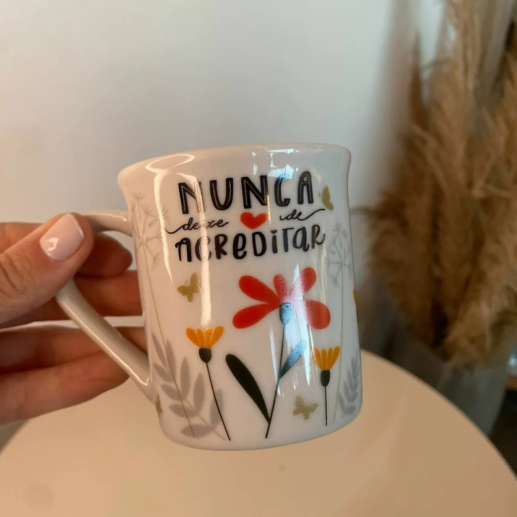 Essa caneca de porcelana é mais do que uma peça utilitária – é um lembrete diário de positividade. Com a frase "Nunca deixe de acreditar" estampada em destaque, ela transmite inspiração e delicadeza em cada detalhe. As flores coloridas e as borboletas complementam o design com um toque alegre e otimista.