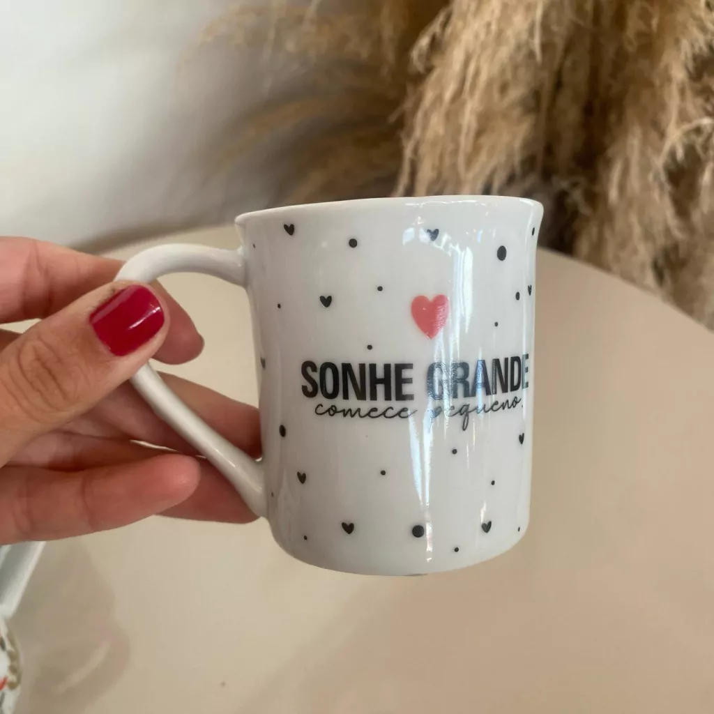 A caneca "Sonhe Grande, comece pequeno" é um lembrete gentil de que todo grande projeto começa com um primeiro passo. Com frase motivacional e ilustrações suaves, ela transforma um simples momento de café em uma pausa cheia de significado.