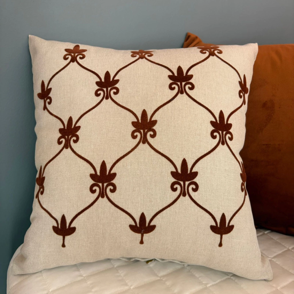 Esta capa de almofada une o charme do linho com o requinte do bordado aveludado, formando um delicado desenho de flores em tom caramelo. A combinação das texturas cria uma peça rica, acolhedora e extremamente elegante.