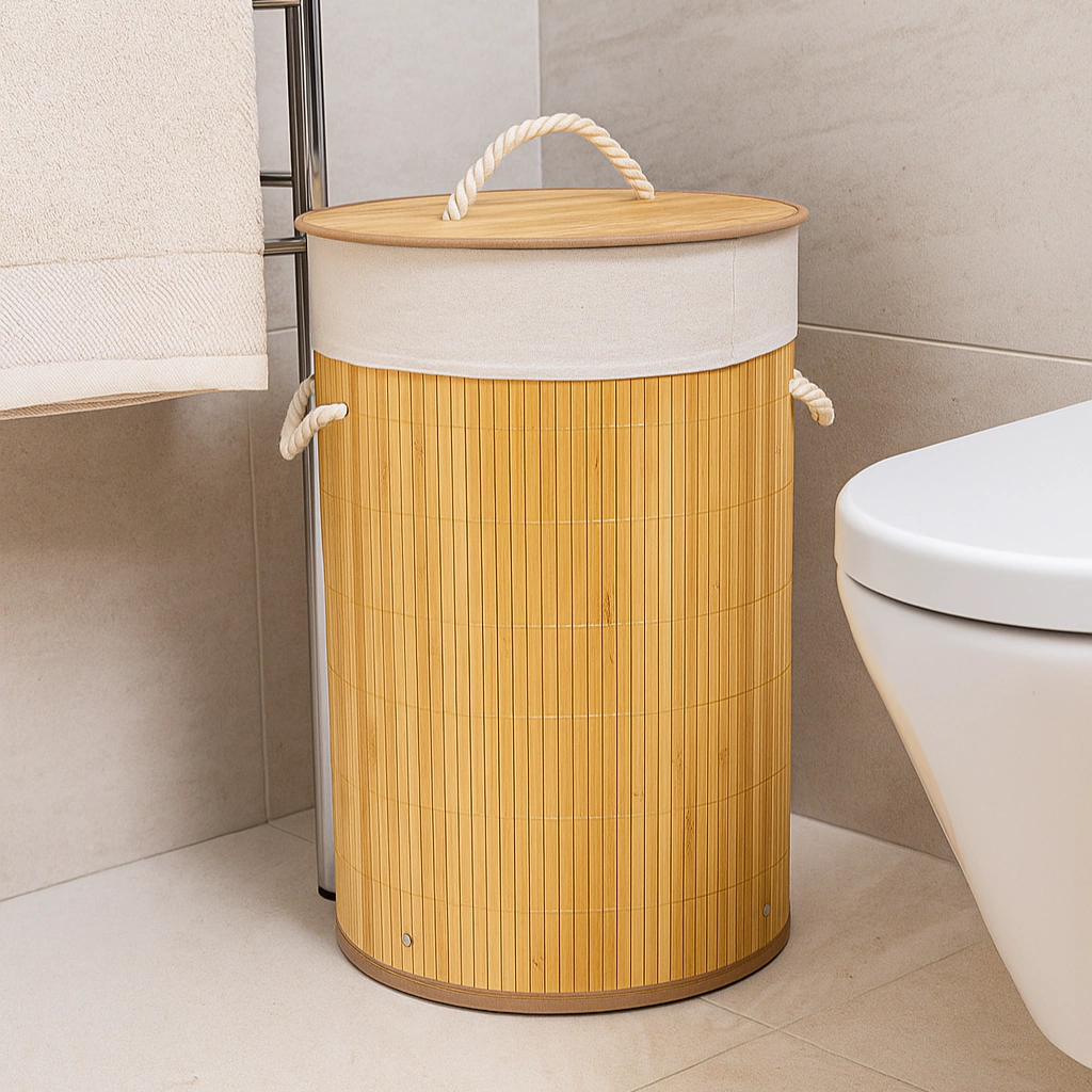 Produzido em material resistente, o cesto possui estrutura firme e acabamento natural, enquanto a tampa em bambu adiciona um toque moderno e sustentável à peça. Seu design clean e atemporal combina facilmente com diferentes estilos de decoração, sendo ideal para lavanderias, banheiros, quartos ou closets.