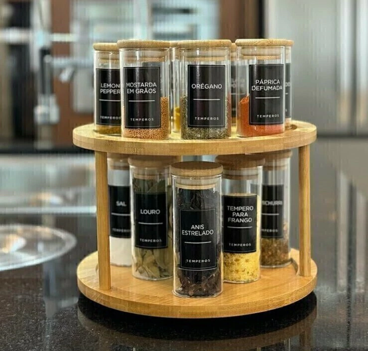 Tampa: Bambu natural com fechamento hermético, preservando aroma e frescor dos temperos.