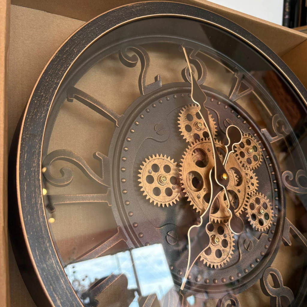 Esse relógio une funcionalidade e estilo industrial com um visual impactante. Com acabamento vintage em tons de cobre envelhecido e preto fosco, ele possui engrenagens decorativas que realmente giram, adicionando movimento e personalidade ao ambiente.